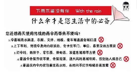 反(fǎn)向傘三大技術突(tū)破 1、反向傘打破了普(pǔ)通傘(sǎn)必須向下(xià)拉傘枝收攏的動作技術難題,反向收縮可以極大程度上縮小手動占用空間。 2、骨架外露(lù)技術 人性化的(de)骨架外露(lù)技術(shù)是人體工程力學和支撐力學的完美(měi)結合體。使得傘架可以輕鬆(sōng)收縮自如。 3、節點傘骨(gǔ)技術 節點傘骨技術是通過(guò)控製收縮點(diǎn)比例和數量(liàng)以(yǐ)減少雨傘收縮對骨架的磨損,極大的增加了雨傘的使(shǐ)用壽命。