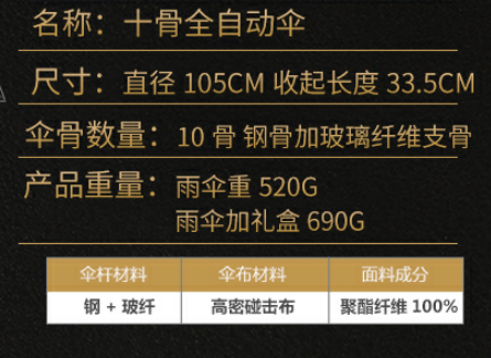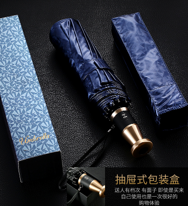 隻有進入了雨傘這一行業才會發現原來雨傘裏麵也是有(yǒu)非常(cháng)多學問的。有各種(zhǒng)各樣款式的雨傘,例如折疊傘(sǎn)、直杆(gǎn)傘(sǎn)、反向傘、兒童傘、情侶傘、高爾夫傘、遇水變色傘等等(děng),今(jīn)天我們來(lái)說說折疊傘。 這是一(yī)把霸氣的(de)折疊(dié)傘,為何要這樣(yàng)說呢,因為它擁(yōng)有抽屜式的包裝(zhuāng)盒,一鍵開收的金屬手柄,零透光黑膠塗層傘布(強力阻隔紫外線,防曬更(gèng)專(zhuān)業),玻纖傘骨(堅固結(jié)實,強力抗風)等等優秀功能集齊一身。